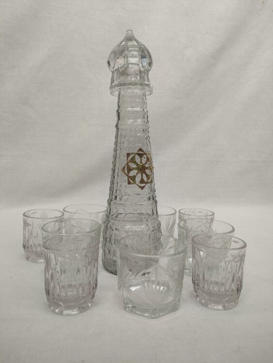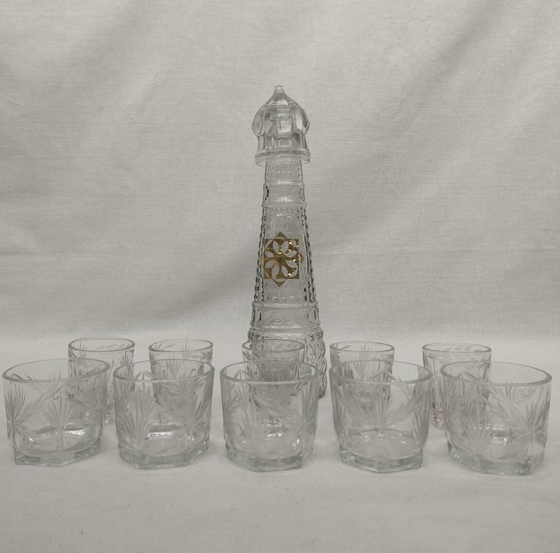 Продам красивый стеклянный набор: графин + 10 стаканов. Полный комплект из 11 предметов в отличном состоянии — все целое, без сколов, трещин и дефектов.
