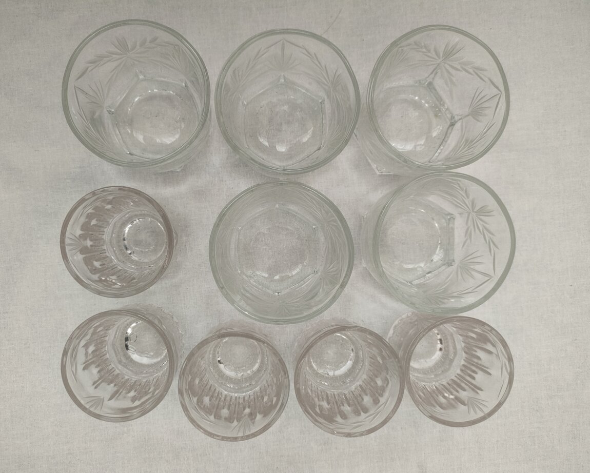 В наборе 5 маленьких стаканов для водки, коньяка, настоек и других крепких напитков, а также 5 больших стаканов для сока, вина, компота, воды, лимонада и коктейлей.