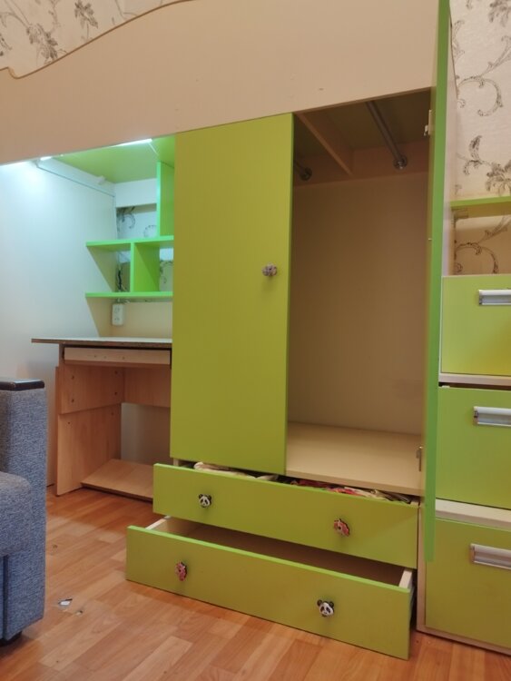 Кроватка нижнего яруса- отдельно стоящая. По необходимости изголовьем помещается слева от шкафчика под вторым ярусом. Также имеет выдвижной ящик.