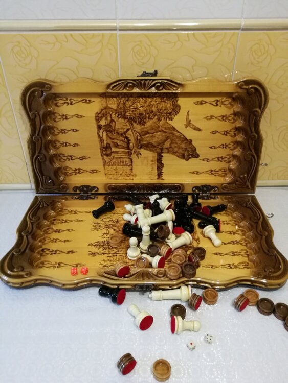 Нарды шахматы ручная резьба вырезанные со всех сторон и боков также и внутри нард на бортах есть резьба цветные био лаки нарды облагорожены чеканкой по дереву размер нард 60см на 60см фигурки и фишки ясень дуб кубики кость. Поиграл и повесил на стенку украсит любой интерьер и создаст уютную обстановку а не будут пылиться в углу. Широкий выбор в наличии выбирайте. Пишите звоните телеграм ватцап вайбер и мы вам поможем выбрать эксклюзивные нарды ручной резьбы а не дешевую поделку вырезанные на станке выдающую за ручную резьбу!