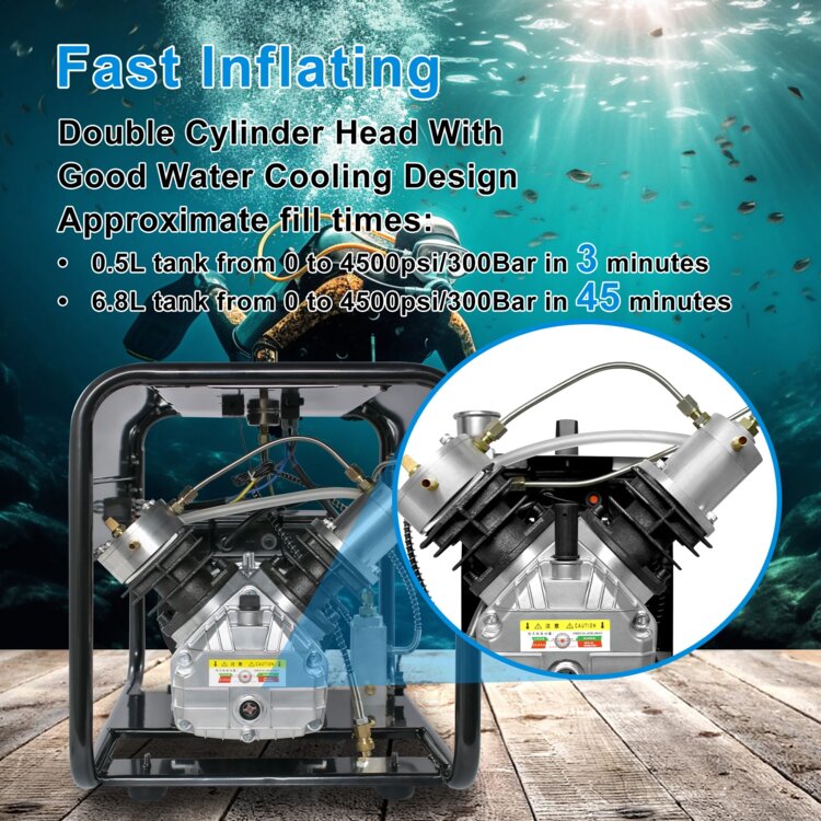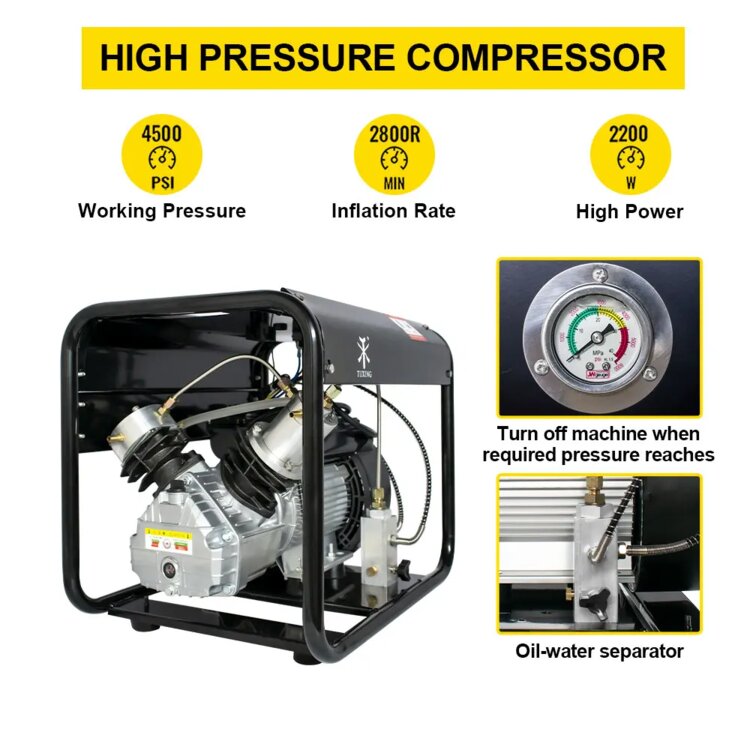 Компрессор высокого давления для дайвинга. Оборудован под метан, для заправки автомобиля (сразу в баллон, через заправочное устройство). Охлаждение водяное. Установлены 3 системы безопасности: давление, температура и поток системы охлаждения. При достижении заданного давления или температуры, а также при пропадании потока системы охлаждения, - компрессор отключится. Также установлен релейный модуль с пультом для отключения на расстоянии.