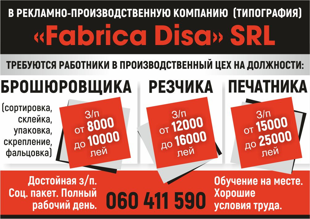 В рекламно-производственную компанию (типография) « Fabrica Disa » SRL требуются работники в производственный цех на должность брошюровщика З /п от 8000 до 10000 лей