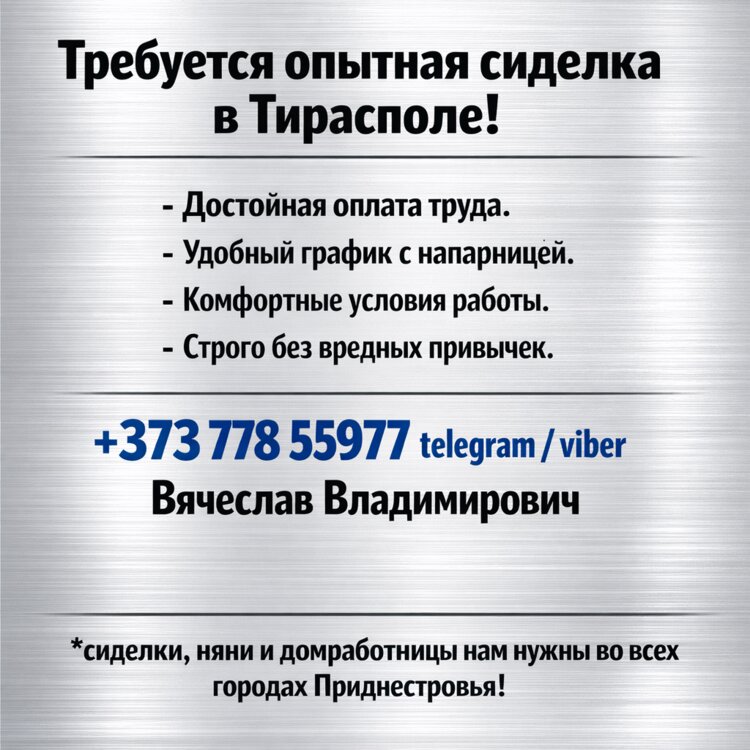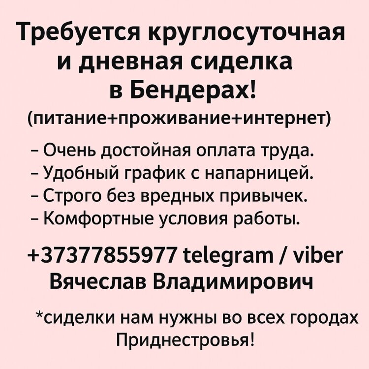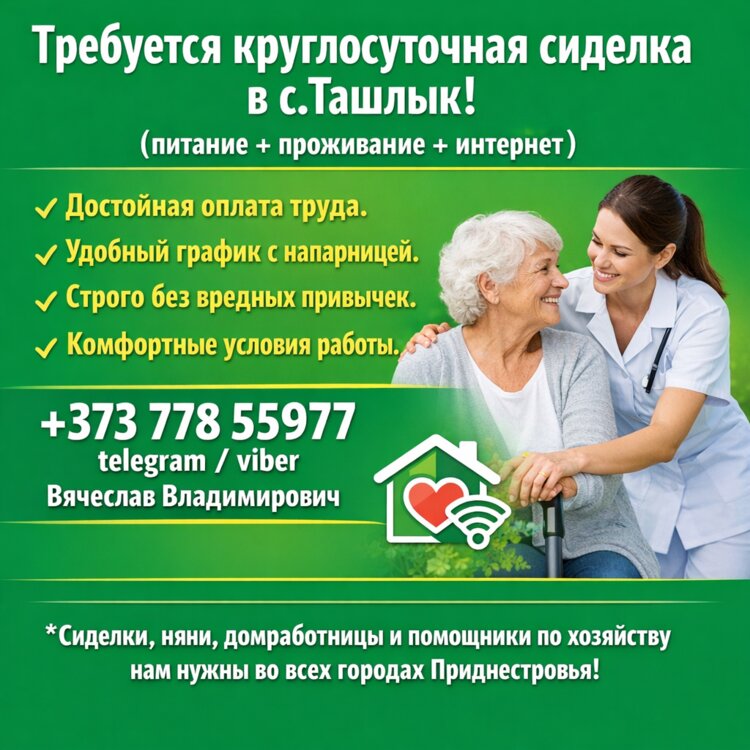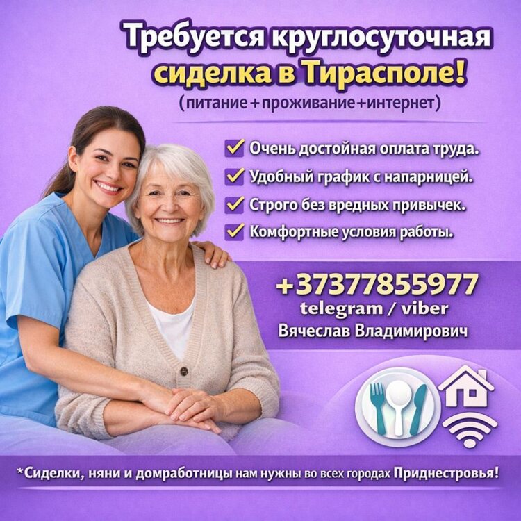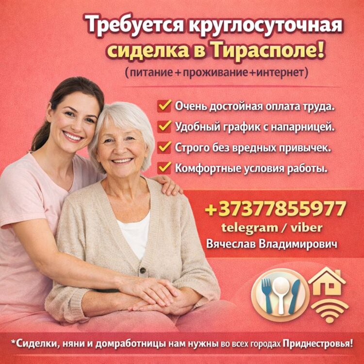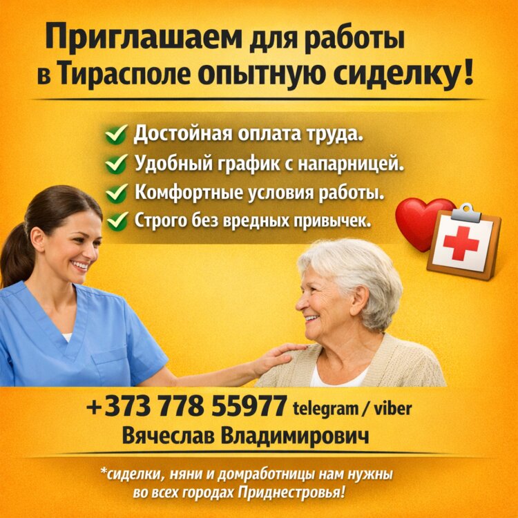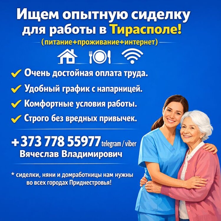 Также можем предложить варианты работы сиделкой в дневную, ночную или круглосуточную смену в Тирасполе, Бендерах, Рыбнице, Дубоссарах и других городах Приднестровья с напарницей и без.