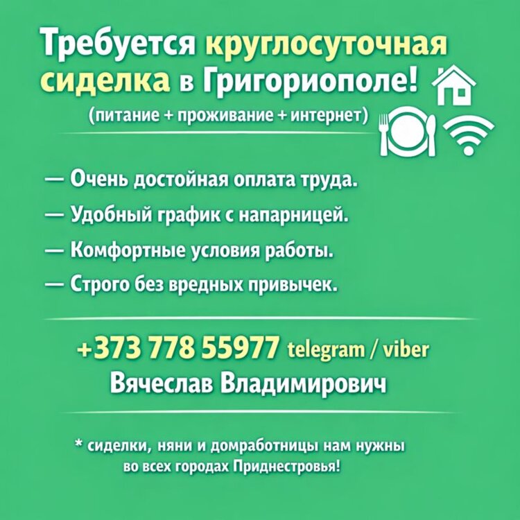 Ищем круглосуточную сиделку для работы по сменам с напарницей в Григориополе, с очень достойной оплатой труда!