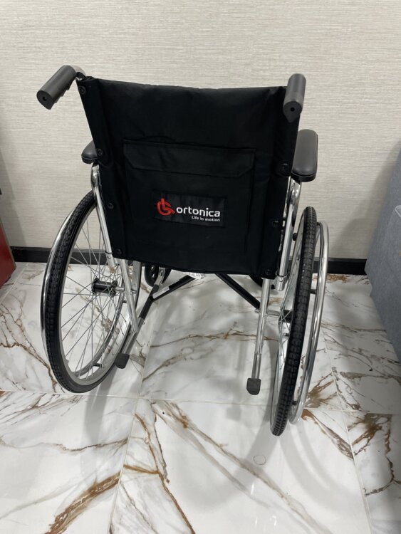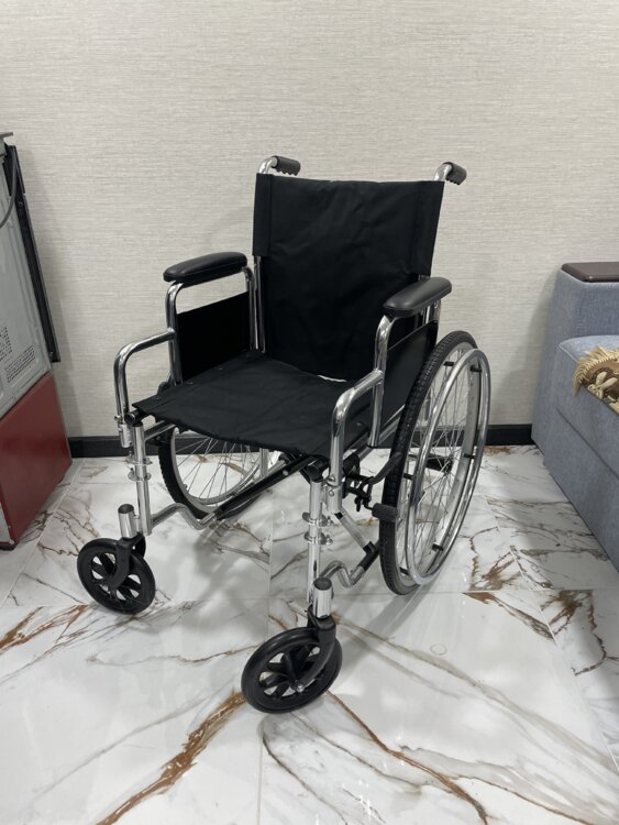 Кресло-коляска с ручным приводом от обода, в хорошем рабочем состоянии. Прочная стальная конструкция с хромированным антикоррозийным покрытием. Складная, удобна для хранения и перевозки. Оснащена стояночными тормозами с двух сторон, цельнолитыми передними и задними колесами, фиксированными подлокотниками и поворотными подножками. Подходит для использования дома, в стационаре и на улице.