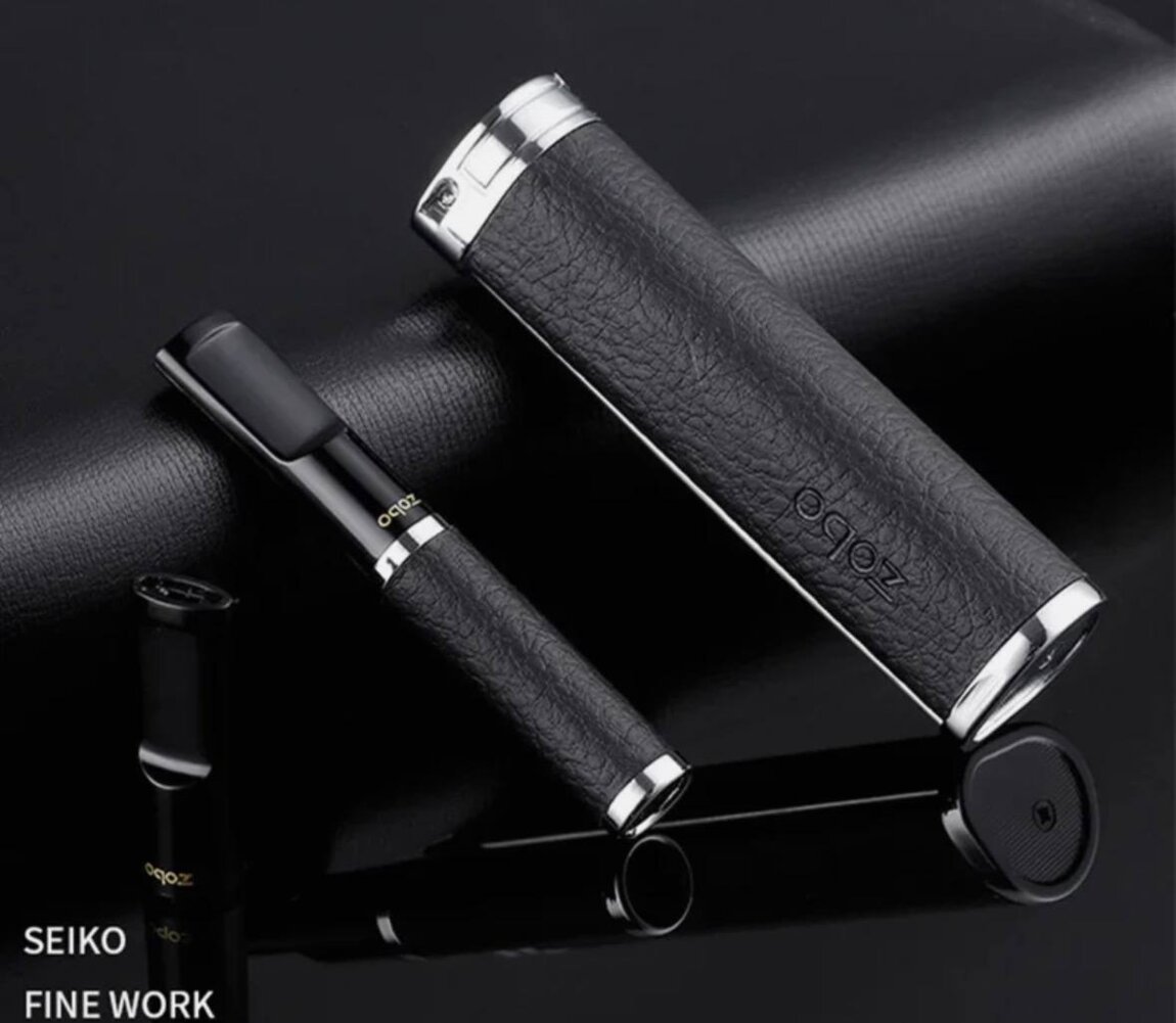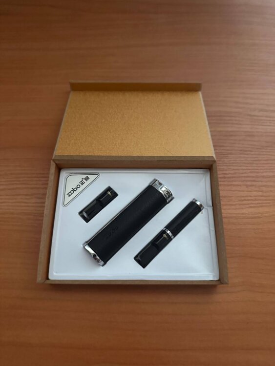 Сигаретный мундштук фирмы Zobo, выполнен из металла со вставкой из кожи, в комплекте кейс и сменный наконечник.