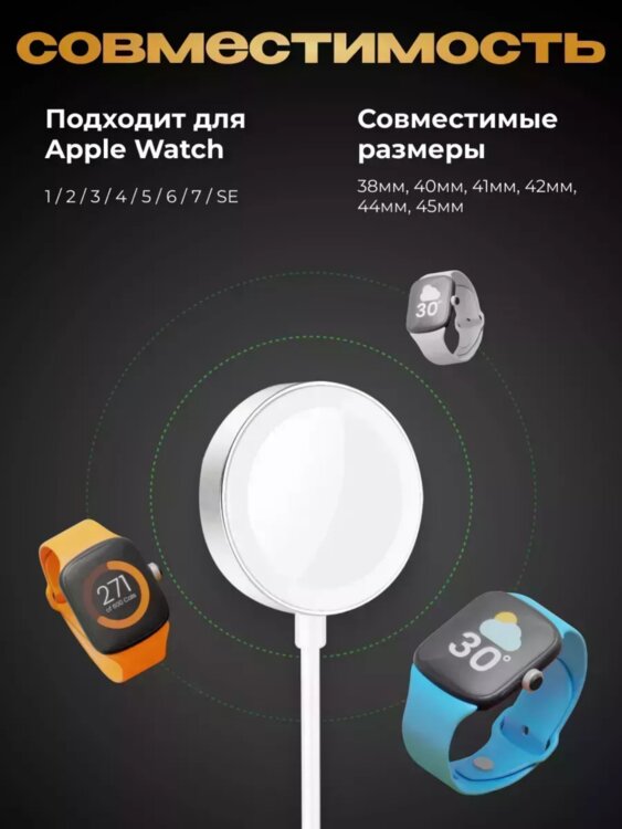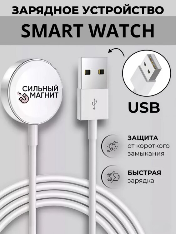 Магнитная зарядка для Apple Watch Smart Watch 1, 2, 3, 4, 5, 6, 7 SE предназначен для зарядки умных часов от Apple. Устройство состоит из метрового кабеля и круглой магнитной станции, оснащенной штекером USB.