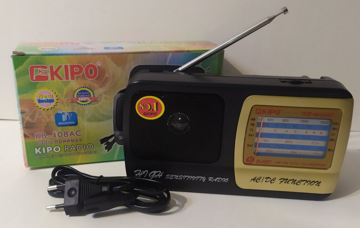 KIPO KB-408AC — компактный портативный радио‑приёмник, работающий как от сети 220 В, так и от двух батареек R20, с поддержкой диапазонов FM, AM, SW и аналогового ТВ — удобный вариант для дачи, дома или путешествий.