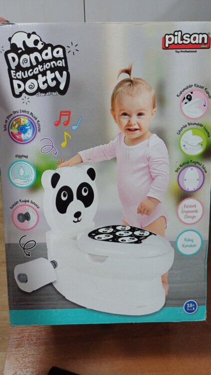 Детский горшок -унитаз. Горшок оборудован съёмной спинкой, слив имитирует встроенная кнопка с эффектами, она воспроизводит реалистичный шум воды и подсвечивается разными цветами во время активации. Есть держатель для туалетной бумаги;