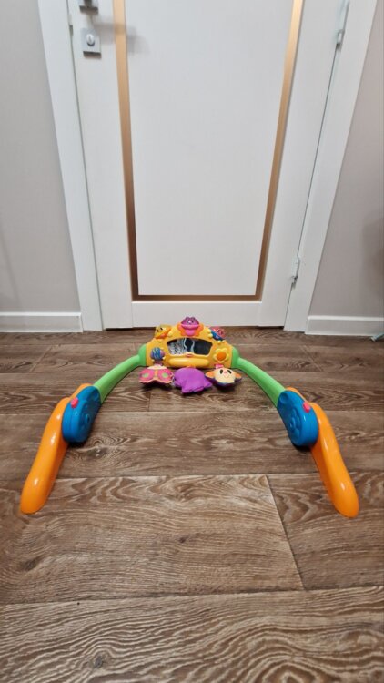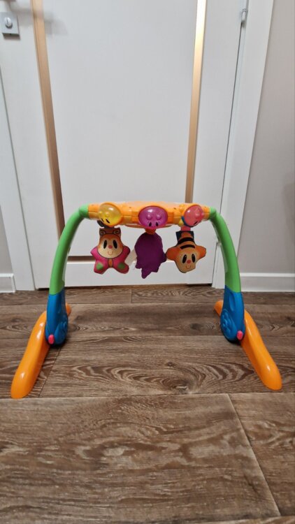 Имеет два положения, лежа и стоя. 3 верхние кнопки издают разную мелодию. Две боковые игрушки толкаются с мелодией, центральная игрушка при натягивании возвращается в исходное положение с вибрацией.