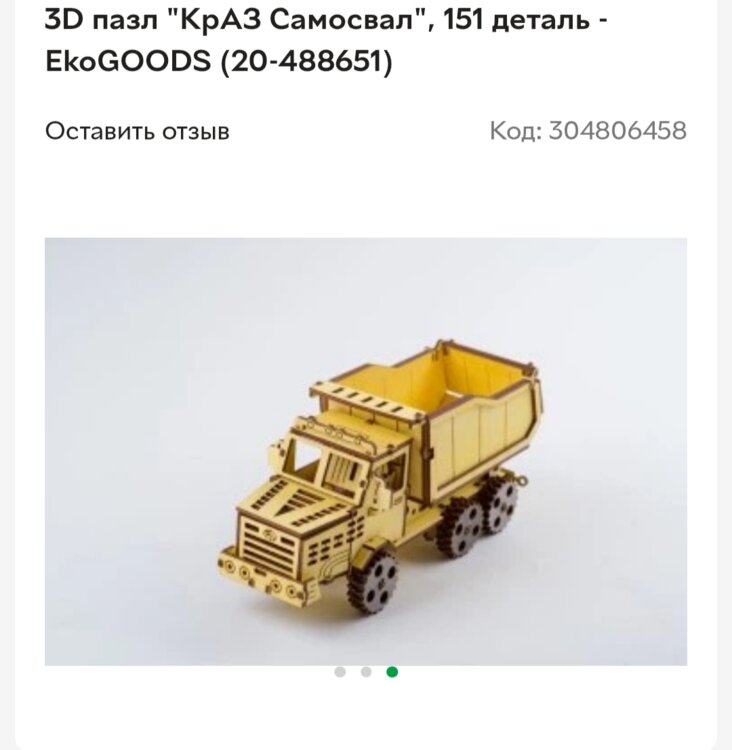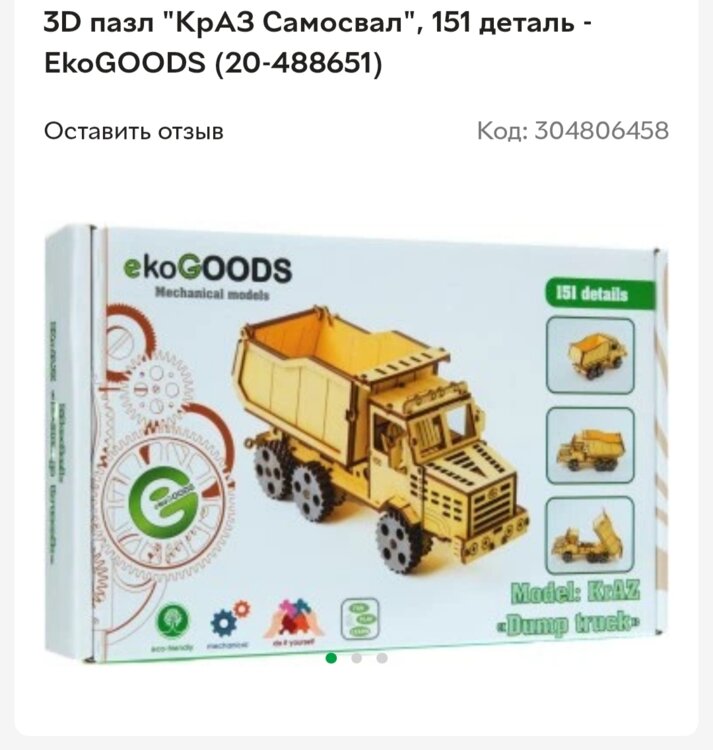 Оригинальный 3D пазл «КрАЗ Самосвал» от бренда EkoGOODS станет необычным и полезным подарком для подростка или взрослого. Собирая пазл, очень легко отвлечься от суеты, сосредоточиться и окунуться в мир детской беззаботности. Результат досуга удивит каждого: собранный пазл – это необычная 3D модель автомобиля размером 28x10x13 см, которая станет очень стильным дополнением коллекции. Набор состоит из 151 детали, каждая из которой изготовлена из качественной, экологически чистой и прочной фанеры. Собранная фигура не распадается, поэтому ее можно смело перемещать при необходимости. Изделие легко собрать по инструкции, поэтому даже подросток отлично справится с поставленной перед ним задачей. 3D пазл – это хороший способ развить внимательность, логическое мышление и сообразительность. Возраст: от 14 лет; Материал: фанера; Размер: модель 28 x 10 x 13 см; Комплектация: 151 деталь; Производитель: EkoGOODS; Сделано в: Украина