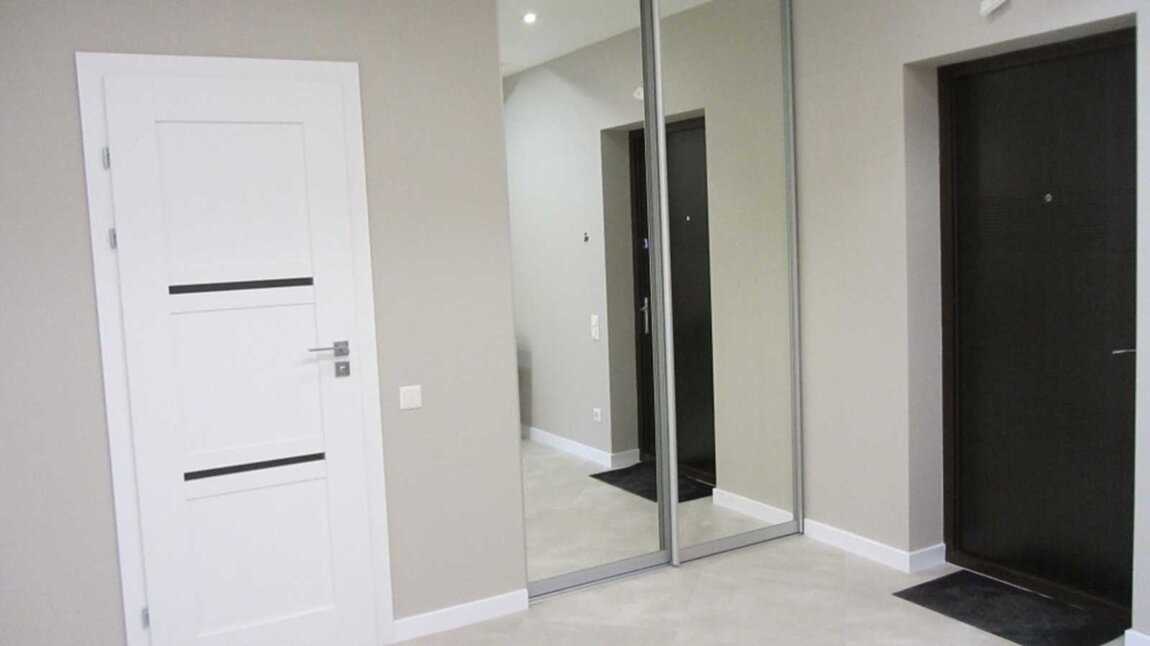 В прихожей большая гардеробная с зеркальными дверями, стол.