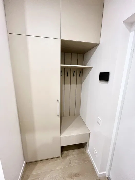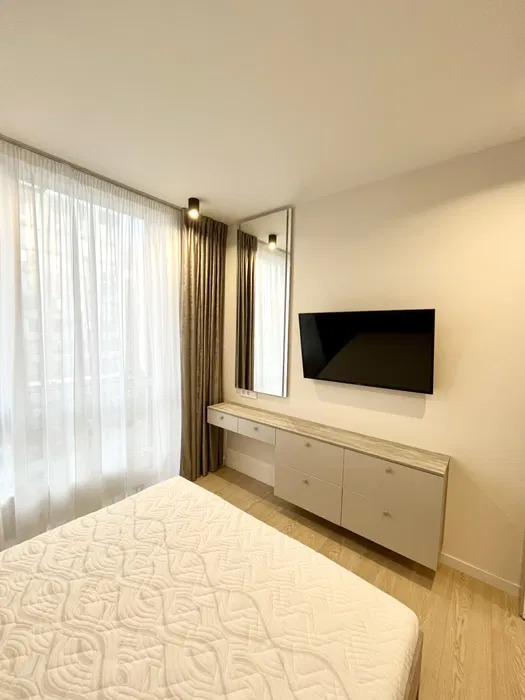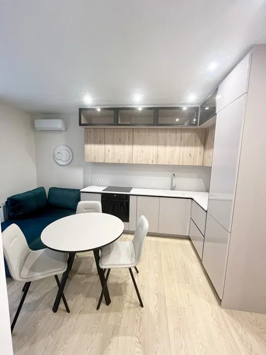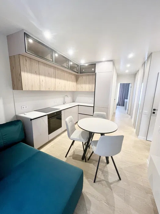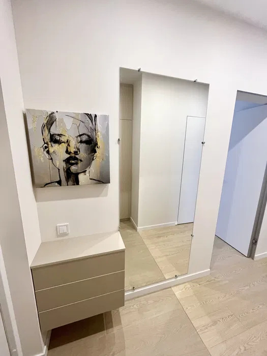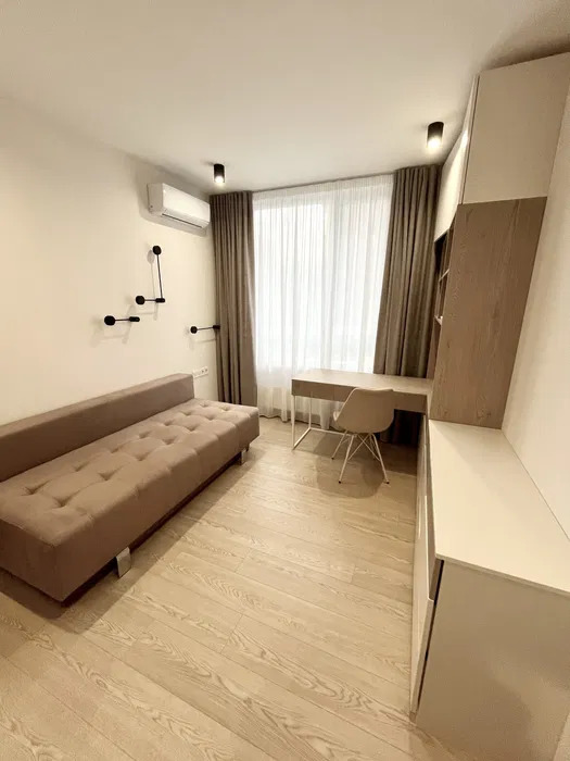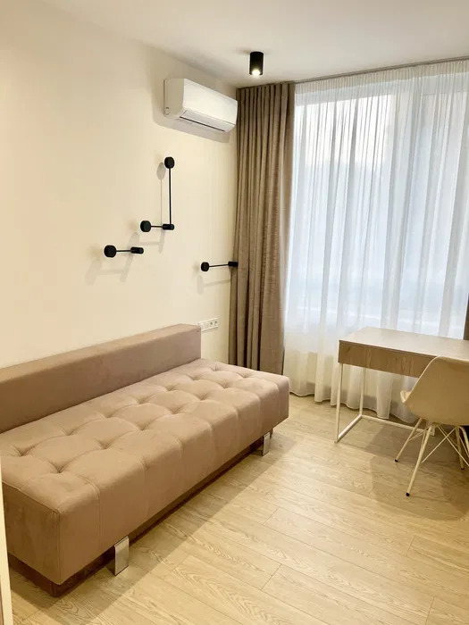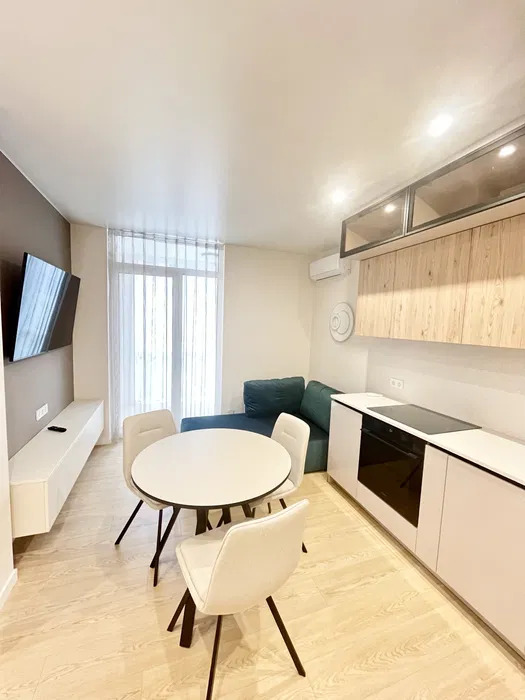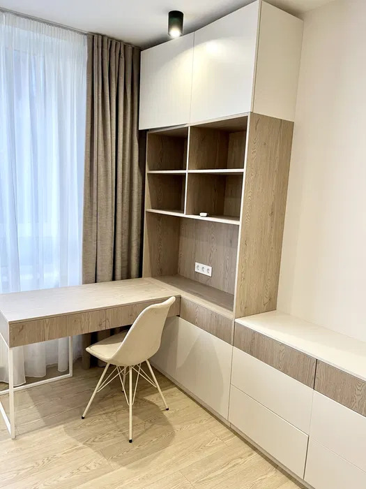 Просторная кухня-гостиная имеет полностью укомплектованную рабочую зону и зону отдыха с удобным диваном и телевизором, 1 спальня с двухместной кроватью, а также кабинет или детская комната, остекленная лоджия с мебелью, много шкафов для хранения, есть подогрев пола в санузле и кухне.