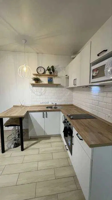 Кухня оборудована всем необходимым (духовой шкаф, варочная панель, микроволновка, чайник, вытяжка, холодильник).