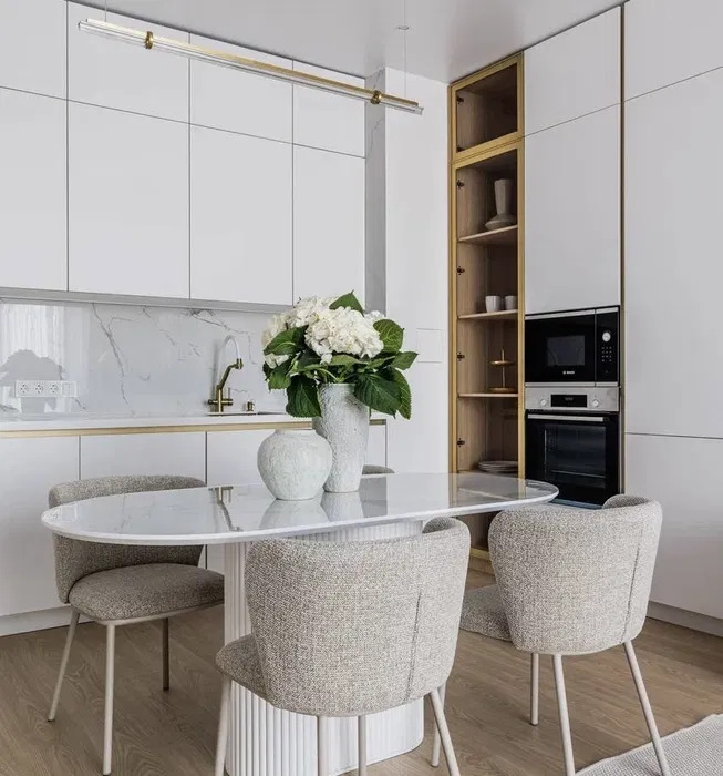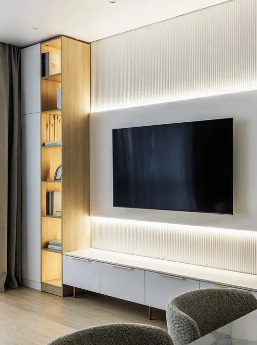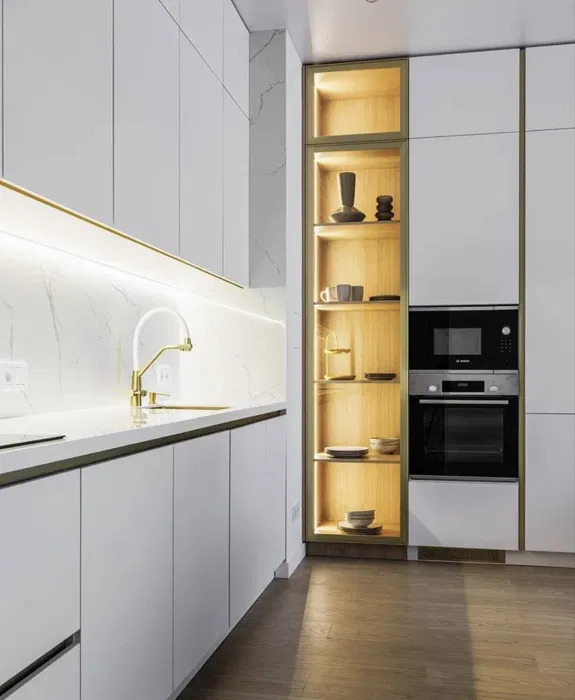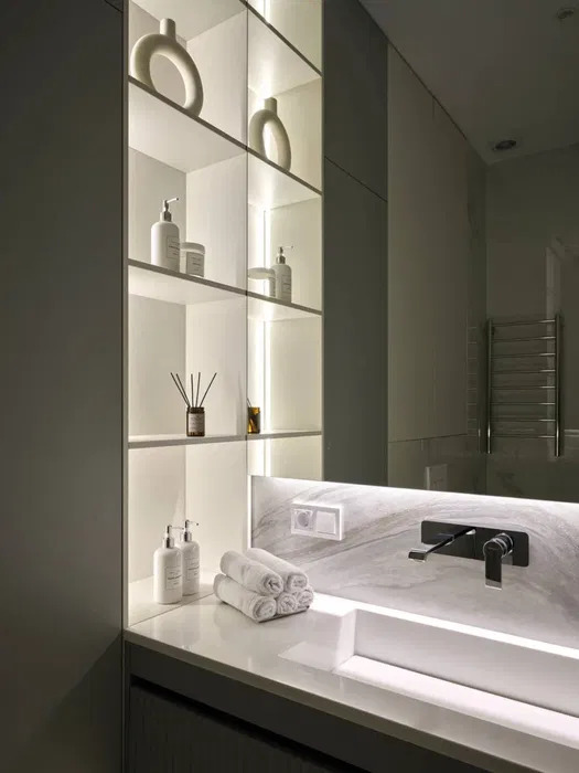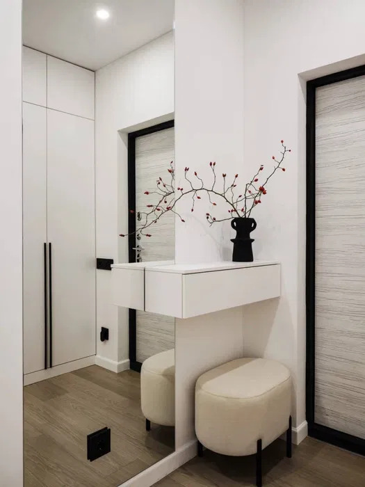У кожній зоні знаходиться система зберігання: шафи, тумби. У ремонті використовувалися матеріали виробництва Італії та Німеччини, меблі виготовлені на індивідуальне замовлення.