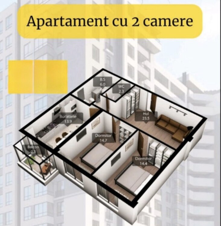 Locuința are o suprafață de 79.10 m2, se află la etajul 11 (nivel 12) din 13 și este compartimentată în: 2 camere, living, bucătărie, balcon, grup sanitar separat si holl.