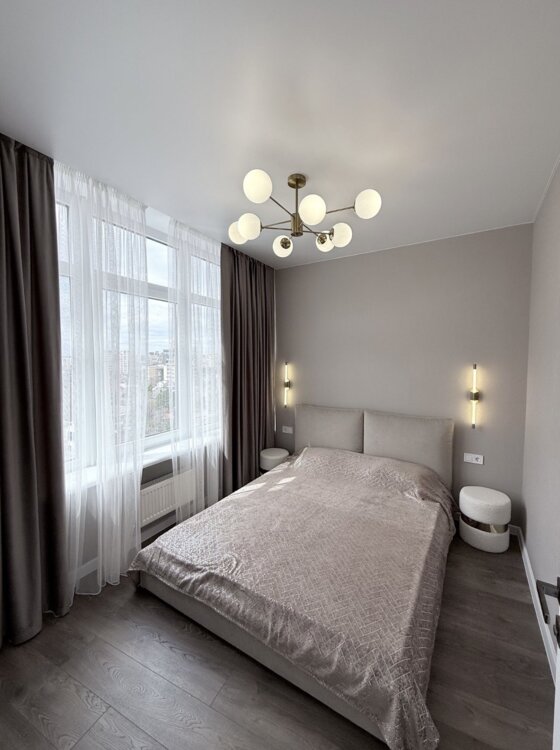 Распланирована в кухню-гостиную, спальню, совмещенный санузел. Гардеробная.
