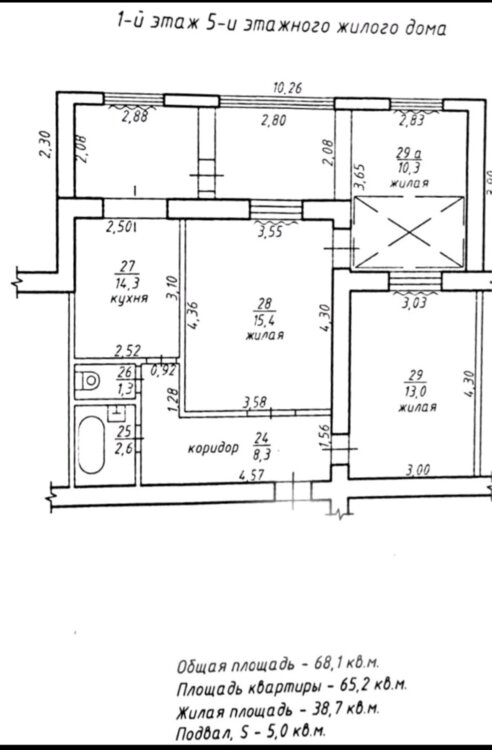 Общая площадь - 68,1 м2. Жилая 38,7 м2. Подвал 5 м2. Балкон- пристройка 21 м2 с 2 комнатами.