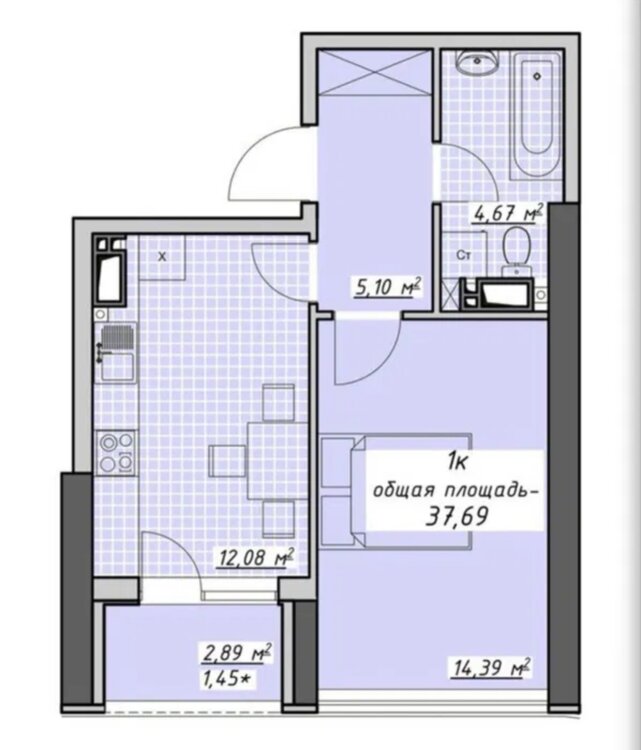 Общая площадь 37,69м², кухня 12,08 м²