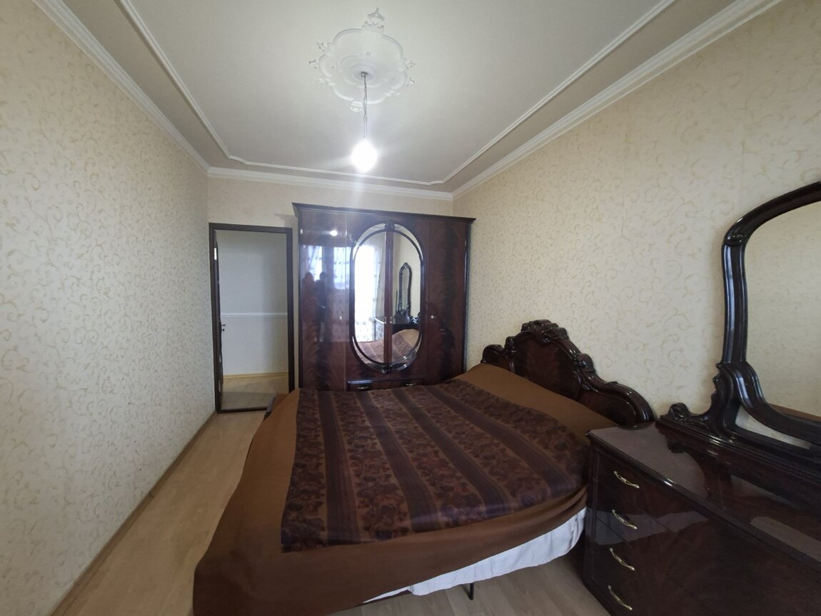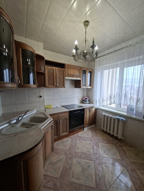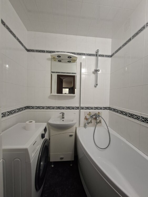 В квартире остаётся встроенная кухня, зеркальный шкаф-купе, кровать, мебель в спальне, стиральная машинка.