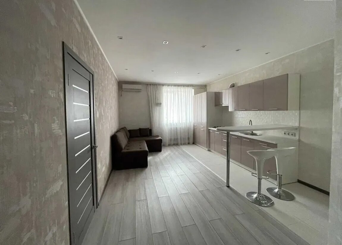 Площадь 49м2, просторная кухня - студия и отдельная спальня.