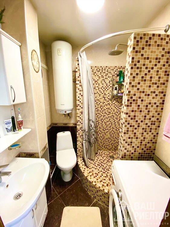 Санузел совмещенный, облицован плиткой, интегрирована душевая кабина.