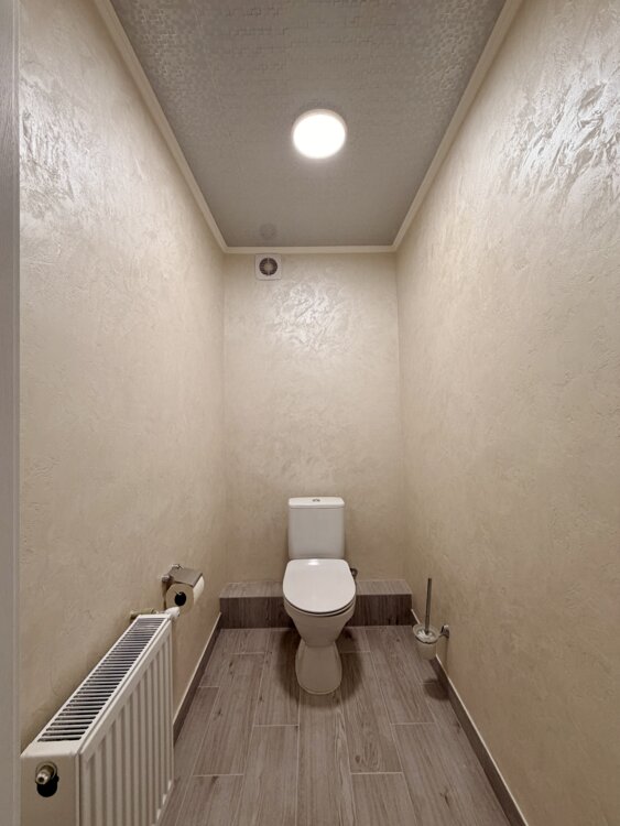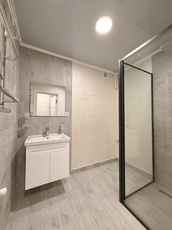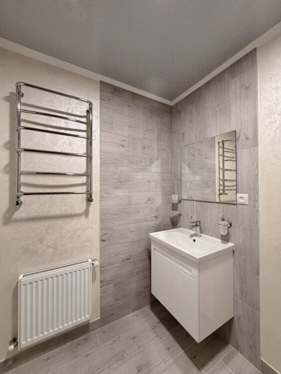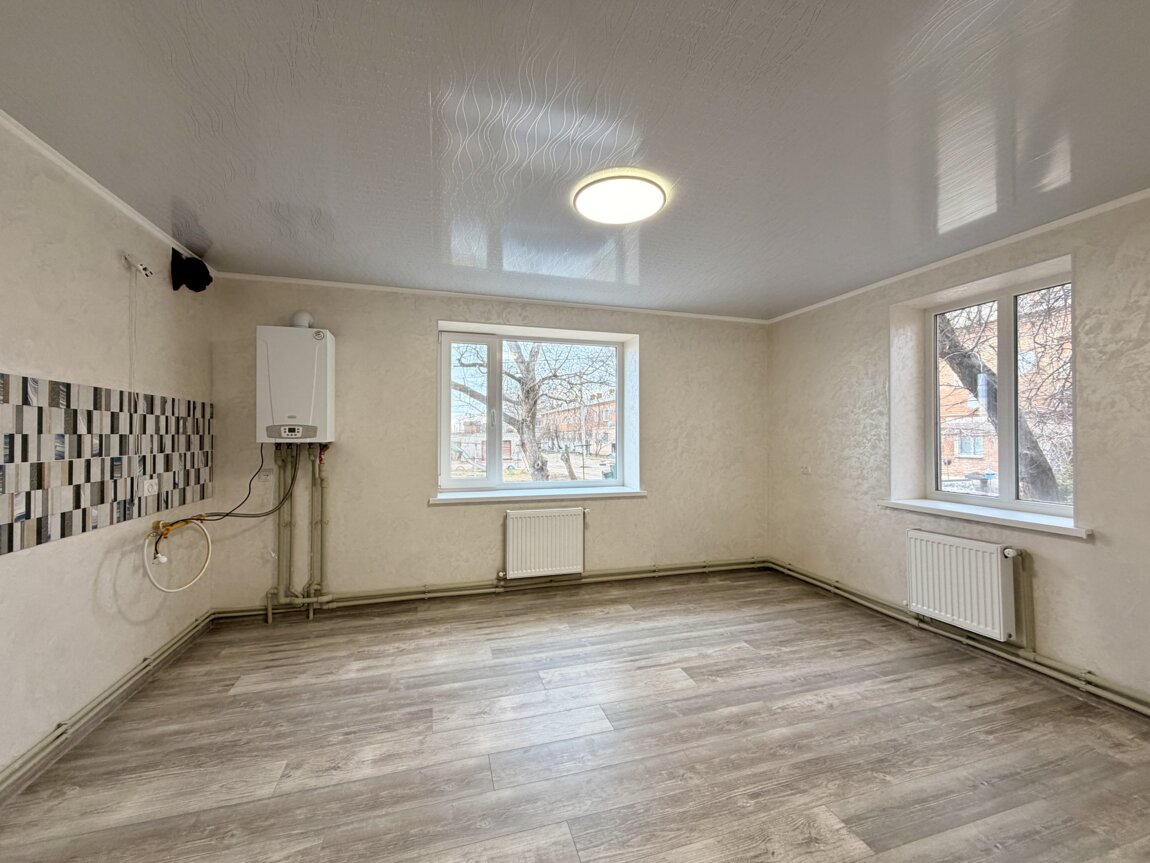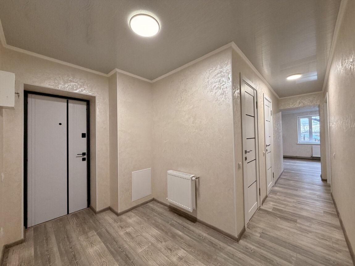 У 3 кімнатах стіни оздоблені веніціанською штукатуркою, одна кімната (гардеробна) в шпалерах, натяжні стелі (крім коридору та кухні), на підлозі - ламінат. Ванна - 4,2 кв. м. у плитці з душевою кабіною, Всі вікна металопластикові, проводка замінена, новий газовий котел, всі батареї євро, нова пластикова розводка труб та сантеника. Після ремонту ніхто не проживав. Ремонт робився для себе.