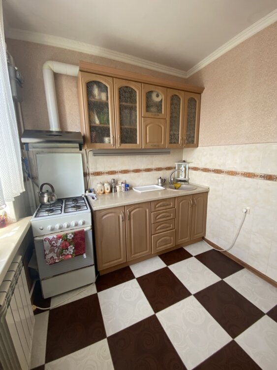 На кухне имеется кухонный гарнитур. На полу керам. плитка.