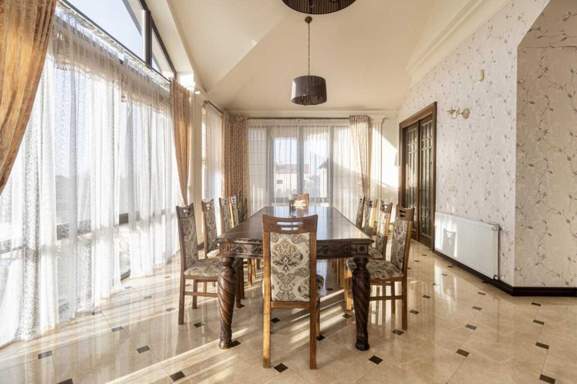 Загальна площа будинку 490.5 кв.м, житлова площа 149 кв.м, кухня 22 кв.м, індивідуальне газове опалення, підігрів підлоги, спортзал, Зимовий сад, гараж, 4 санвузли, 6 спален. 2 гардеробні.