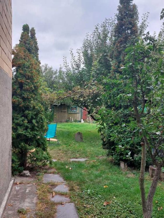 Ділянка прямокутна 6 соток, газон, сад, сарайчик. Водяна свердловина, обладнана насосною станцією. Біотуалет, раковини - на подвірї. Фруктовий сад - два десятки плодоносних дерев та ягідні кущі яблуні, сливи, черешні, горіхи, виноград, агрус, смородина, малина.