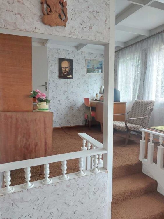 Будинок двоповерховий цегляний, перекриття дерев’яні, дах оцинкована бляха, віконні рами деревяні. Загальна площа 92 кв.м, є гараж, балкон. Житлова площа 47 кв.м : чотири спальні - три по 9 кв.м, одна 11 кв.м, кімната 9 кв.м, хол 9кв.м, кухня 7,5кв.м.