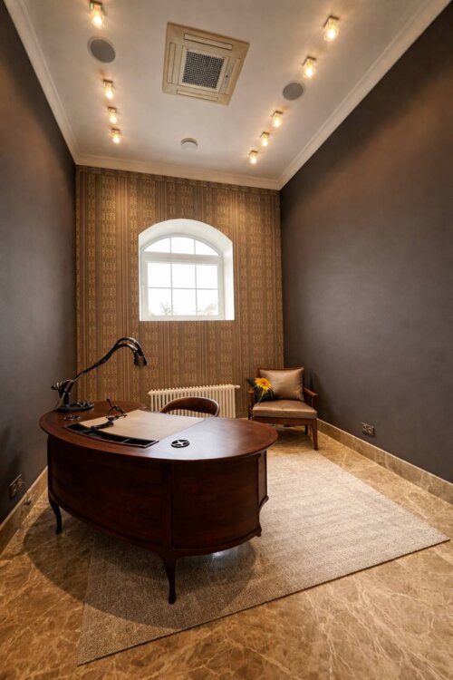 Інтер’єр виконано у вишуканому стилі з використанням дорогих натуральних матеріалів, що створюють атмосферу витонченої розкоші.