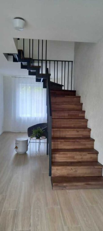 Лестница обшита деревом ясень, металлические современные перила. Безопасна для детей и животных.