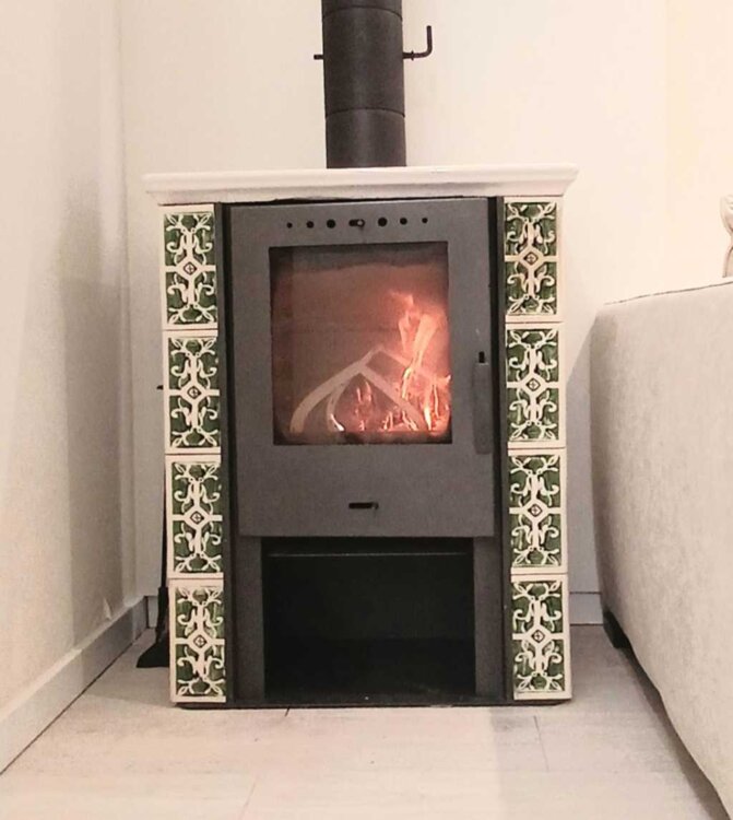 В гостиной так же большой семейный диван и камин-печь Flama, обогревающий помещение за 10-15 мин (2кг дров в час/при обычной работе может прогреть 200м3). Очень экономичный при использовании. Эстетичный и
