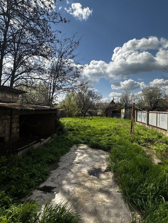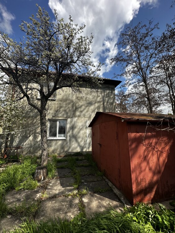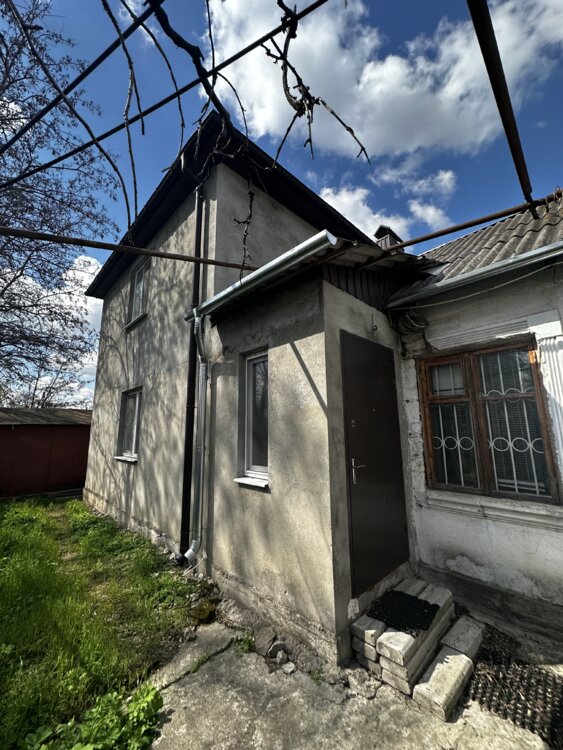Дом из 2 х частей, имеет 2 входа, бутовый, есть гараж металлический.