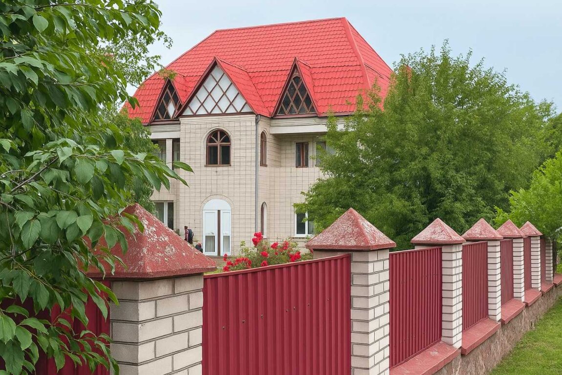 Побудований з білої цегли, бетонні перекриття, дах утеплений покритий металочерепицею.