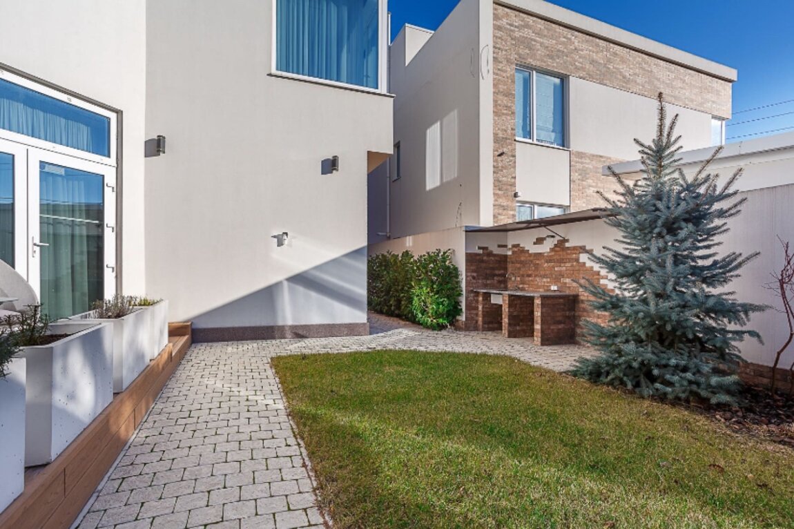 34145 Продам новый современный дом с дизайнерским ремонтом на улице Архитекторская. Общая площадь — 160 м², дом построен с использованием дорогих и качественных материалов. Участок 3 сотки полностью благоустроен: выполнен ландшафтный дизайн, оборудована зона барбекю, а на крыше расположен просторный террасный этаж 60 м² с возможностью отдыха или зонирования под лаунж-пространство. Есть встроенный гараж на 50 м² с удобным входом из дома. Планировка продумана до мелочей. На первом этаже — просторная кухня-гостиная с панорамными окнами и выходом на открытую террасу, гостевая спальня, санузел, котельная и постирочная. На втором — мастер-спальня с личным санузлом и гардеробной, две детские комнаты также с гардеробными, дополнительная ванная комната и выход на террасу. Дом укомплектован системой «Умный дом», видеонаблюдением, пультовой охраной, автоматическим поливом и дизель-генератором. Все городские коммуникации подключены, установлен выгодный тариф с льготами на отопление. Никто не проживал. В стоимость входит вся мебель и техника — идеальное решение «заезжай и живи» в спокойном и престижном месте.