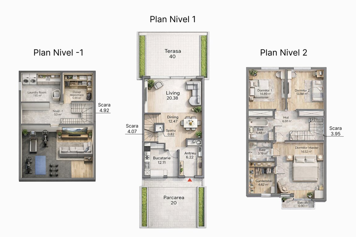 Subsol: spațiu pentru laundry room, depozitare, beci/vinotecă sau amenajare sală sport, cinema, zonă relaxare.