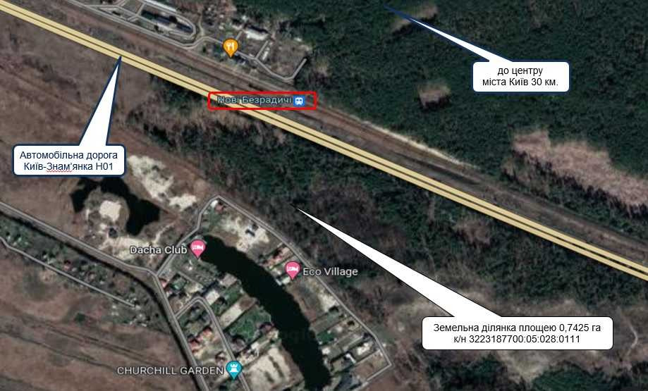 Ділянка прямокутної форми з виступом, вільна від забудови, знаходиться в другій лінії від фасаду, посеред лісової місцевості в 100 м. від залізничної станції Старі Безрадичі, уздовж пролягає автомобільна дорога Київ-Знам’янка (Н01).