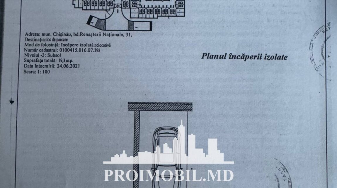 Spre vânzare loc de parcare, amplasată la nivelul -3 al unui bloc locativ nou, în sect. Râșcani, str. Renașterii Naționale. Suprafața totală de 19.3 mp. Dotări și finisaje: * Prima linie. Este în imediată apropiere de: parc, grădiniță, școală, piață, cafenele, bancă, farmacii etc. Acces facil la transportul public în orice direcție a orașului. (d.f.) Zonă cu trafic intens pietonal și transport în orice direcție. Acces la pistă Loc de parcare. Telefon: 3737808888 Кишинёв, Рышкановка Ренаштерий Национале Продается парковочное место на уровне -3 нового жилого комплекса,сект. Рышканы, ул. Ренаштерий Национале.Общей площадью19.3 кв.м.Преимущества:* Первая линия.Рядом парк, школа, детский сад, аптека, супермаркет и т.д.Свободный доступ к общественному транспорту. (д.ф.) . Телефон: 3737808888