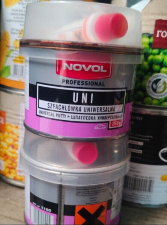 Универсальная автошпаклевка Novol UNI (250г). Отвердитель в комплекте под крышкой. Подходит для ремонта кузова, отлично заполняет неровности. Новая, не вскрывалась.
