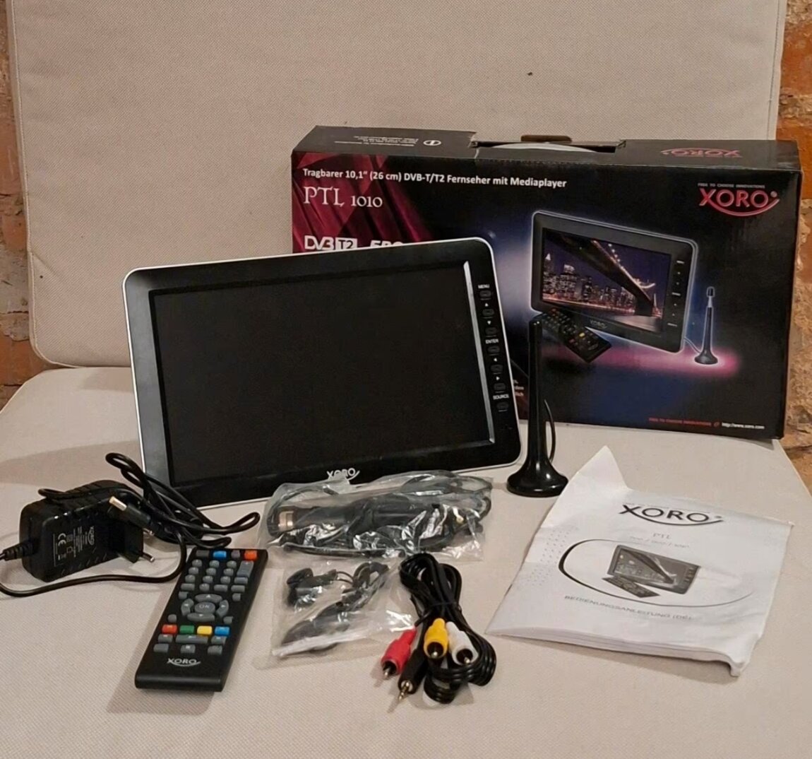 Телевизор, Xoro 7 дюймов экран, комплект всё, что на фото, 12V-220V, встроенный аккумулятор (держит +. - 5 часов), встроенная приставка DVB-T2 для просмотра бесплатных каналов. Также имеются входы AUX. USB. Micro USB. HDMI. RCA.