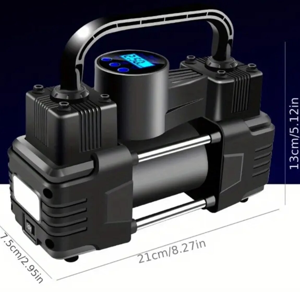 Портативный автомобильный компрессор с двумя цилиндрами. Оснащён цифровым манометром, автоматическим отключением при достижении нужного давления и встроенным фонариком для удобства использования в темное время суток. Подходит для накачки шин автомобилей, велосипедов и других транспортных средств. Компактный размер (21×13×7,5 см), прочная конструкция и удобная ручка для переноски. Отличное решение для автолюбителей и в качестве аварийного набора.