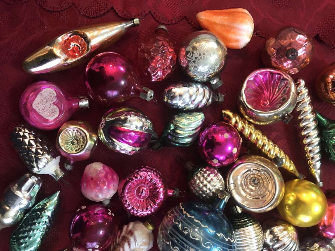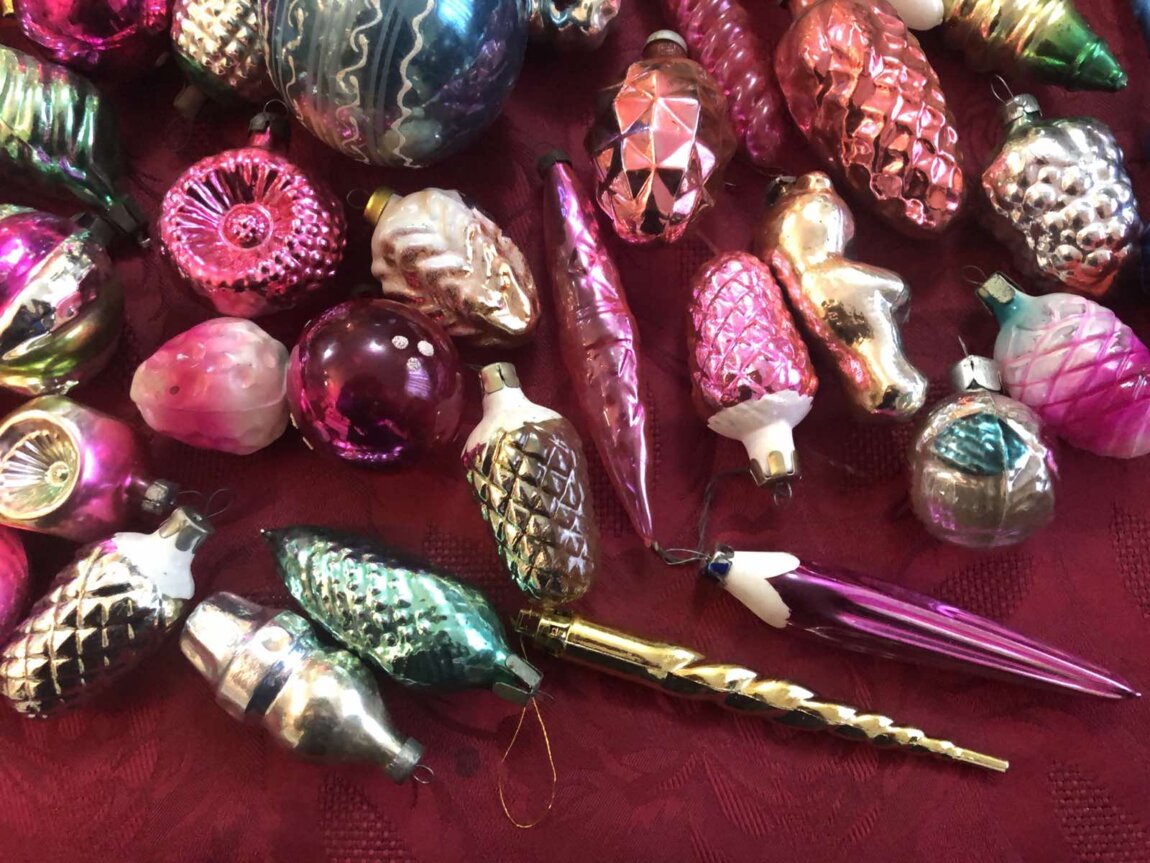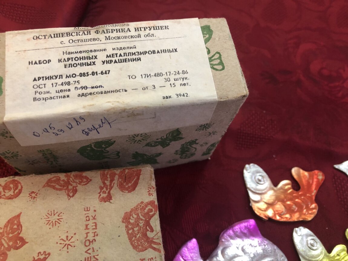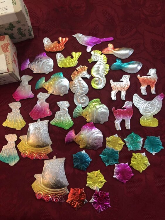 Советские стеклянные ёлочные украшения, картонажные фольгир. фигуры