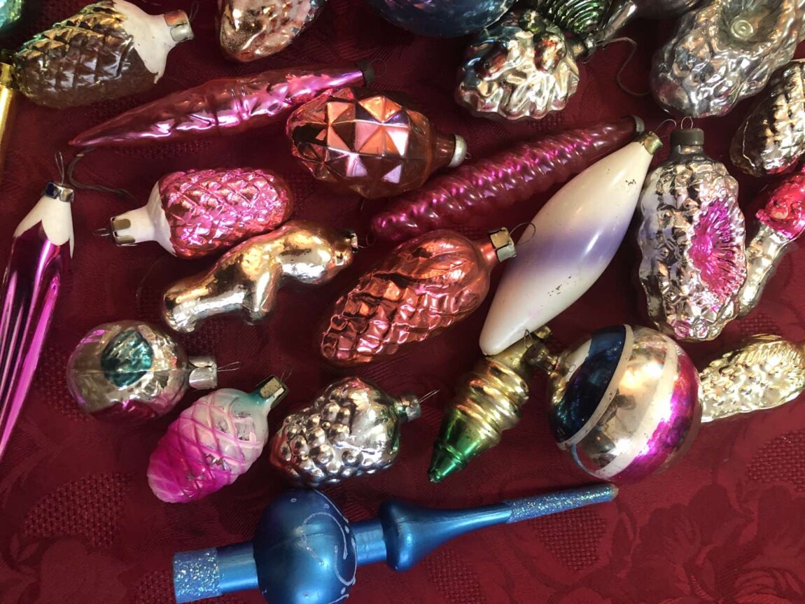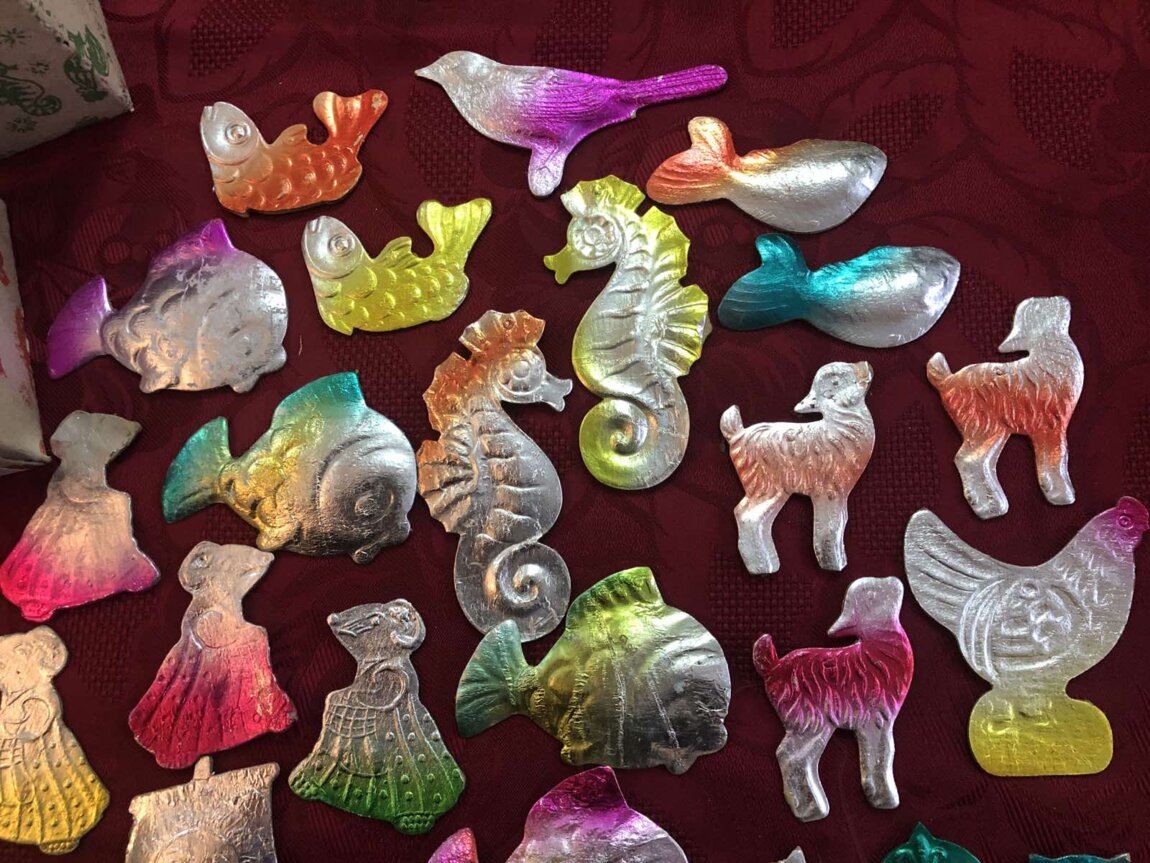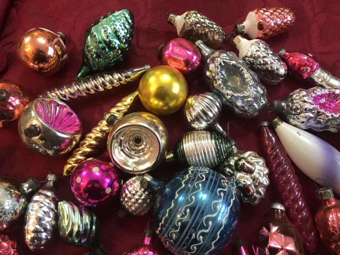 Советские стеклянные ёлочные украшения, картонажные фольгир. фигуры