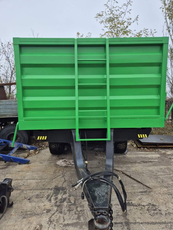 Конструкція причепа виконана з високоміцної сталі, кузов має тришарнісний гідравлічний механізм розвантаження (назад та вбік), що забезпечує зручність і швидкість роботи. Підвіска на ресорах гарантує плавність ходу, а гальмівна система — безпечне пересування навіть із повним завантаженням.