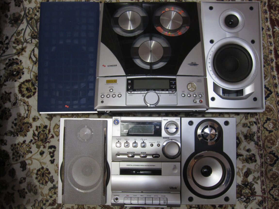 Отличныe музцентры vitek с рабочим только радио -400 л schneider-600 л колонки 2+1-350 л и 2- 100 л vitek отличный- 400 лей небольшой занимает мало места радио ловит отлично звук очень чистый сильные басы звонкие высокие магнитофон возможно работает -нет ролика сд -провод отсоединен возможно тоже работает музцентр schneider- 600 лей немецкое качество все работает 3- дисковый + радио + aux - вход и выход+ пoдключение subwoofer сильные басы басовик - 155 мм и очень звонкие высокие тонкий можно переносить колонки пристегиваются можно и лежа установить центр регулировка высоких и низких частот и супербаса колонки 2 + 1- 350 лей микролаб несмотря на малые размеры отличный бас и высокие для компьютера и телефона колонки компьютерные - 100 лей хорошие без торга на ботанике