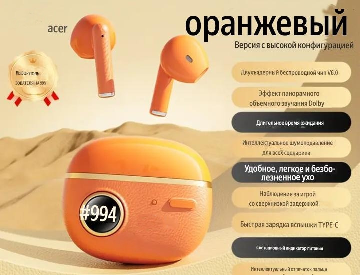 Продам беспроводные наушники TWS: с шумоподавлением для звонков, спорта и бега, внутриканальный дизайн, легкие, сенсорное управление, длительное время работы от батареи, совместимы с мобильными телефонами, планшетами и ноутбуками. Цвет оранжевый