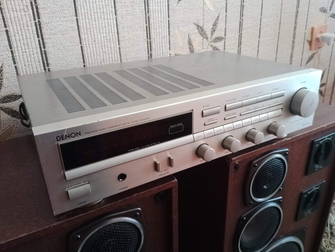 Интегральный стерео усилитель DENON DRA-325R, размеры: 430 x 125 x 310 mm (B x H x T), вес: 7 кг, динамическая мощность 2x100 ват (4 ом), сопротивление от 2-16 ом, имеет охлаждение на фреоне радиатор с медными трубками, громкий и мощный аппарат, полностью весь металлический, made in Japan.