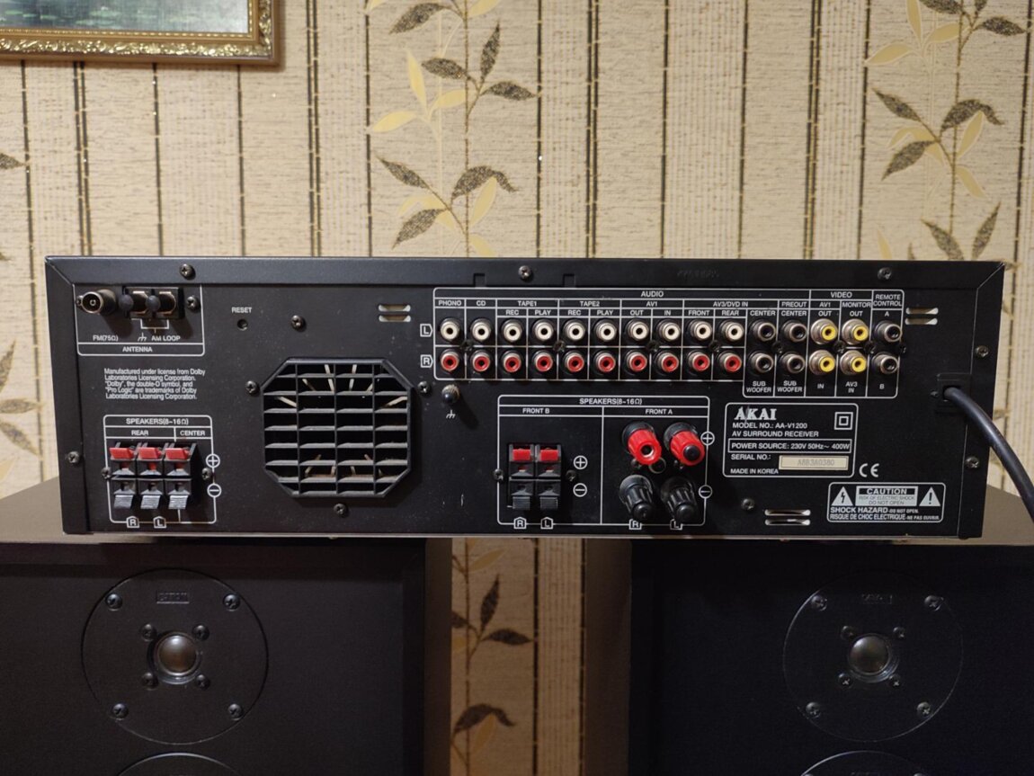 Усилитель-ресивер AKAI AA-V1200, мощность в режиме стерео 2х170 Вт (4 Ом), 2х130-150 Вт (8 ом), усилитель большой и тяжёлый, размеры: (440х150х360 мм), вес 11 кг, имеет выходы на два активных сабвуфера, может работать как усилитель или как ресивер, мощный и громкий аппарат, звучит чище и мощнее чем топовый усилитель Pioneer A-702 R, made in Korea.